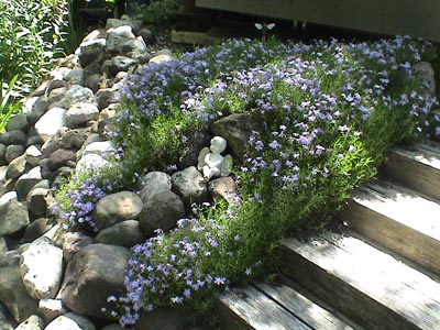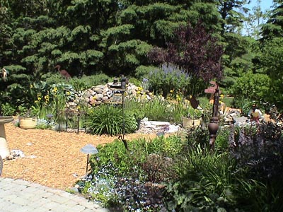 Garden #1 This yard has a little of everything! The lovely terraced rock garden gracing one side contains many lovely varieties of perennials, including cactus and roses. The west side features a more natural area filled with daisies, grasses and other native plants. The fenced in back yard features a spacious lawn and beautiful pond surrounded with abundant water plants adjoining the patio seating area.